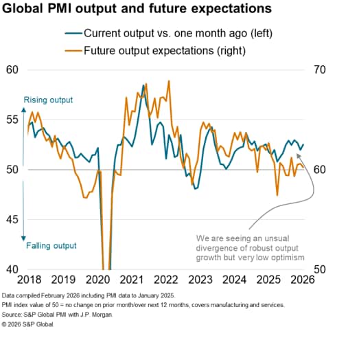 We will also be especially keen to see how overall PMI output levels compare with business sentiment, as a wide disparity continued to persist in January as growth proved resilient despite historically low global confidence (see chart).