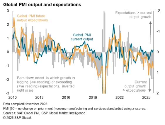 Flash PMI data for the US, eurozone, UK, Japan, Australia and India are issued for November on Friday. The preliminary survey data follow signs of robust and accelerating global economic growth in October's PMI releases, though with business confidence in the outlook having weakened to one of the gloomiest since the pandemic. A key theme to watch in the November PMIs will therefore be whether this lack of confidence has acted as drag on output, demand and hiring, or whether recent central bank rate cuts, signs of an end to the US shutdown, and fewer concerns over US tariffs have helped restore some optimism to the business environment.