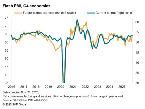 Flash PMI surveys signal robust developed world growth and improved optimism about the year aheadEconomic growth showed encouraging resilience across the four major developed economies as a whole in November, according to S&P Global's flash PMI surveys. Growth across the G4 was the joint-highest seen over the past two-and-a-half years. Business activity growth accelerated in the US and Japan and remained solid in the eurozone. The UK bucked the trend, however, being the only G4 economy to report a disappointing combination of markedly slower growth and falling employment.