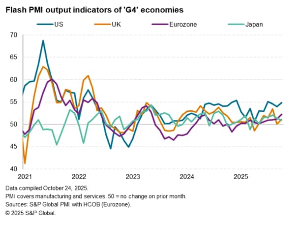 S&P Global's flash PMI surveys showed the US sustaining a solid lead in terms of output growth among the major developed economies in October. Growth accelerated across the combined US goods and services sectors to one of the strongest rates seen over the past three-and-a-half years. However, growth also accelerated in the eurozone to the joint-fastest in almost two-and-a-half years, as improving domestic demand in the single currency area helped drive a stronger service sector expansion and a further recovery of manufacturing output. While relatively lacklustre performances were meanwhile seen in the UK and Japan, both continued to expand.
