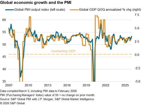A source of encouragement was that, prior to the outbreak of war, the global economy was showing signs of renewed life, which could add to resilience in the face of the Middle East crisis, especially if the war is short-lived. The global PMI's output index hit one of its highest readings since the pandemic in February, signaling an upturn in global GDP growth to an annualized 3.0% rate.