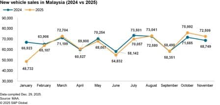 意义:2025年11月,马来西亚新车销量同比增长5.5%,达72,509辆,而去年同期为68,749辆。11月,新车产量同比增长2%,达到62,829辆。