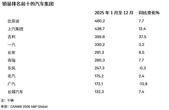 2025年,中国汽车市场以创纪录的出口量和新能源汽车销量完美收官。汽车市场向电动化转型的大趋势,为本土车企创造了在乘用车市场与海外车企同台竞争的机会。专注于新能源汽车领域的比亚迪,2025年销量突破460万辆,其中出口海外市场达105万辆。凭借在混动、插电式混动及纯电动领域的全面布局,吉利集团2025年销量同比大幅增长37.5%,逼近360万辆。旗下子公司吉利汽车在零售销量方面超过大众汽车(VW),跻身中国本土乘用车市场销量第二。整体来看,作为全球最大的纯电动汽车和插电式混合动力汽车生产国,中国去年新能源汽车产销量双双突破1,600万辆。本土车企在电动化转型过程中所积累的生产规模与技术实力,推动其成为全球汽车市场的重要参与者。