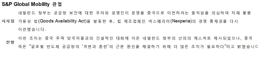 중국 상무부는 네덜란드 측에 넥스페리아 운영에 대한 개입을 종료하도록 다시 압력을 가했습니다. 넥스페리아와 관련된 상황은 해외 시장에서 중국 기업의 권리에 대한 중국의 우려를 제기했습니다. 유럽은 중국 자동차 제조업체뿐만 아니라 공급망 기업들에게 중요한 시장입니다. 해당 지역으로의 강력한 중국 투자 유입과 고조되는 지정학적 긴장에서 오는 압력 속에서, 중국의 입장은 넥스페리아 대치 상황의 향방에 크게 영향을 미칠 것이며, 이는 상황을 취약하게 만듭니다. 유럽 연합 통상 담당 집행위원 마로시 셰프초비치(Maroš Šefčovič)는 이 조치가 공급망 안정화에 도움이 될 것이라고 말했습니다. 독일 자동차 산업 로비 단체인 VDA는 분쟁의 결과로 인한 차질이 해결되려면 아직 멀었으며, 생산에 대한 추가적인 부정적 영향도 배제할 수 없다고 덧붙였습니다. 유럽의 관점에서, 이는 자동차 부문이 공급망 확보뿐만 아니라 미래의 혼란에 대한 복원력을 구축하는 데도 계속 적응하고 혁신해야 함을 보여줍니다. 산업이 진화함에 따라, 더욱 안정적이고 지속 가능한 공급망 생태계를 육성하기 위해서는 자동차 제조업체, 공급업체 및 정부 간의 협력이 필수적일 것입니다.