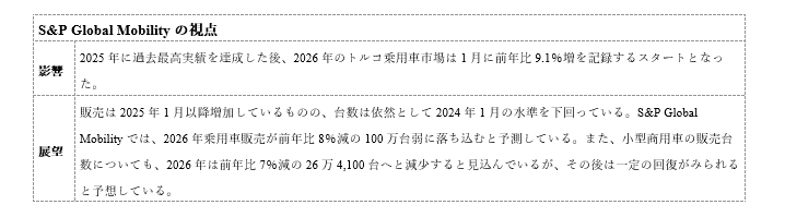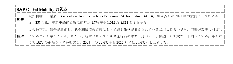 各国政府によるインセンティブ制度、低金利環境の継続、そして激しい競争が、2026年においても一定程度は市場を下支えすると見込まれる。ただし、企業および消費者の信頼感は依然として脆弱であり、マクロ経済や地政学的なショックがわずかに生じるだけでも、市場をさらに後退させかねない状況にある。2026年通年について、S&P Global MobilityはEU乗用車市場が前年比約1.8%増の約1,100万台へと再び緩やかな成長を遂げると予測している。
