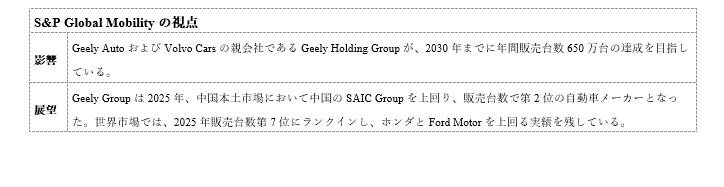 Geely Groupは2025年、中国本土市場において中国のSAIC Groupを上回り、販売台数で第2位の自動車メーカーとなった。世界市場では、2025年販売台数第7位にランクインし、ホンダとFord Motorを上回る実績を残している。 過去1年間、Geelyはブランド間の内部競争によって生じていた非効率性の問題に対処するため、事業の再編と集約を進めてきた。中国市場における電動化への移行もBYDやEVスタートアップによる競争激化への対応を迫り、Geelyが事業戦略を再調整する要因となっている。Zeekr Technologyを米国株式市場から上場廃止したことは、グローバル展開や社内リソース共有といった新たな優先課題に軸足を移す上で、重要な節目となった。Geelyが掲げる2030年戦略目標は、成長の多くが海外事業およびNEV製品ラインからもたらされることを示している。Zeekrブランドは、欧州、中東、オセアニア、東南アジアにおけるプレミアムEV市場を担う、グループの中核となる乗用車ブランドへと位置付けられている。また、ブラジルにおけるRenaultとの提携によって、南米市場でのGeelyブランドの製品投入が加速する。2025年にはGeely EX2およびEX5の2モデルがRenaultの販売ネットワークを活用してブラジル市場に投入された。さらに、合弁会社であるRenault Geely do Brasilが、GeelyのGEAベースのNEVに加え、新たなRenaultブランドのモデルも生産する計画である。
